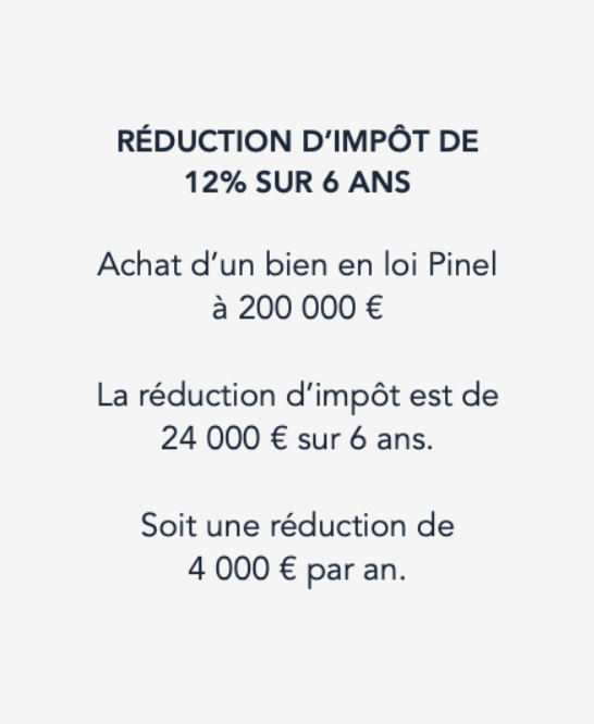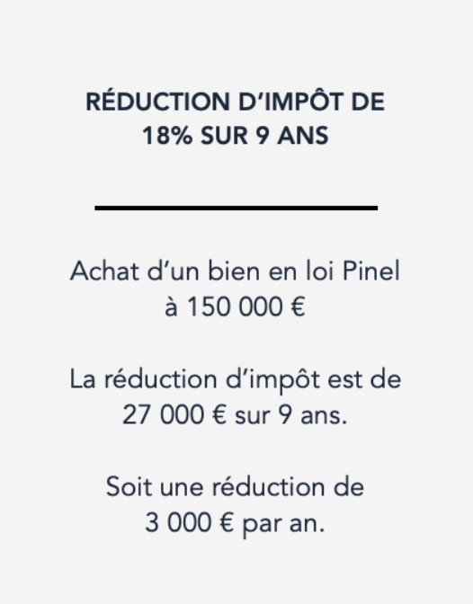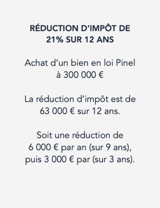 L'investissement locatif Pinel ouvre droit à une réduction d’impôt calculée sur le prix d'achat des logements neufs ou réhabilités pour atteindre les performances techniques du neuf. Mis en place par l’ancienne ministre du Logement, Sylvia Pinel, son objectif consiste à soutenir l’offre de logements sur le territoire en incitant les particuliers à investir dans l’immobilier en échange d’une réduction d’impôt allant jusqu’à 63 000 €.